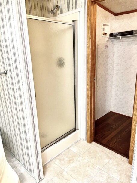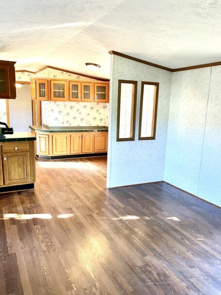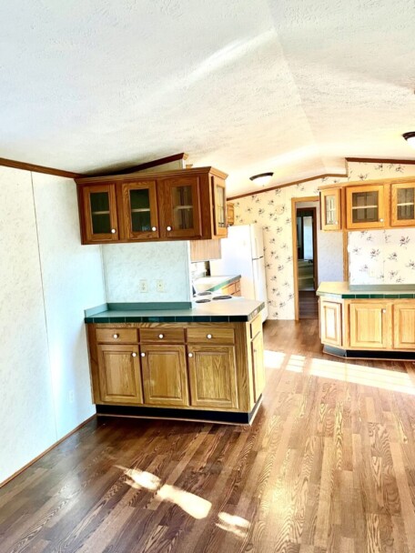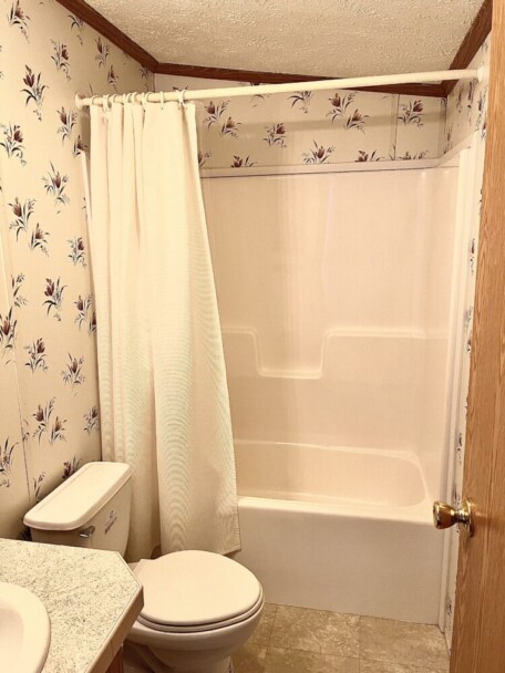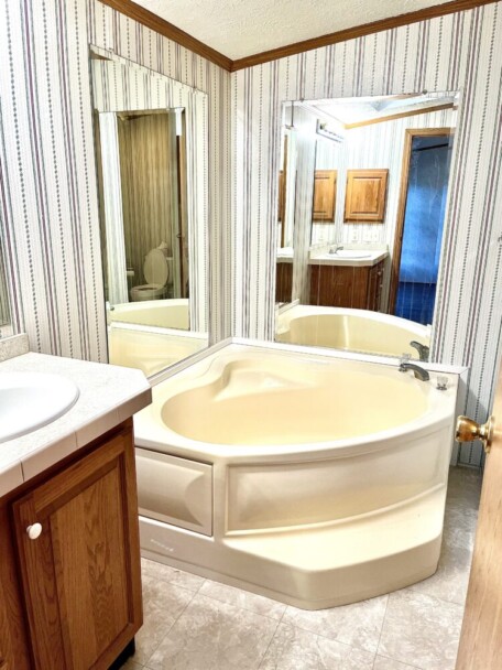 The home has three bedrooms and two full bathrooms. The master bedroom has a walk in closet and the en-suite bath has a large corner soaker tub and separate walk in shower. You can access the walk in closet from either the bathroom or the bedroom. The fully equipped kitchen with dishwasher and over the stove microwave is loaded with cabinets and counter space and is open to the living room. A separate laundry room is off the kitchen and has even more storage. All 3 bedrooms and the living room have brand new Pergo flooring. The kitchen and both baths have vinyl floors.